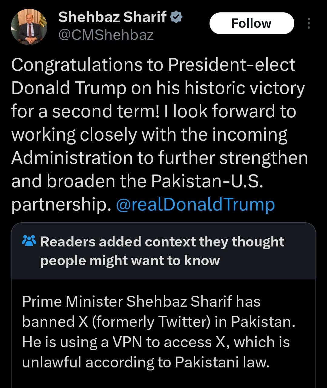 शहबाज शरीफ ने एक्स पर लिखा, "राष्ट्रपति चुनाव में डोनाल्ड ट्रंप को ऐतिहासिक जीत की बधाई! मैं पाकिस्तान-अमेरिका साझेदारी को और मजबूत व व्यापक बनाने के लिए आने वाले प्रशासन के साथ मिलकर काम करने को उत्सुक हूं।" यह संदेश सामान्य परिस्थितियों में कोई समस्या नहीं खड़ी करता, लेकिन पाकिस्तान में एक्स पर प्रतिबंध लगा होने के कारण यह विवाद का विषय बन गया।