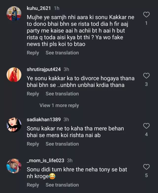 जैसे ही कक्कड़ फैमिली की यह फोटो सामने आई, वैसे ही नेटिजंस ने इस पर प्रतिक्रिया देनी शुरू कर दी। एक यूजर ने अनुमान लगाया कि क्या सोनू का पिछला नोट मनगढ़ंत था और लिखा, "मुझे ये समझ ही नहीं आ रहा कि सोनू कक्कड़ ने तो दोनों भाई-बहन से रिश्ता तोड़ दिया है। फिर आज पार्टी में कैसी आई है। अच्छी बात है आई, लेकिन रिश्ता क्यों तोड़ा? हां वो फर्जी खबर थी प्लीज कोई बताओ।"