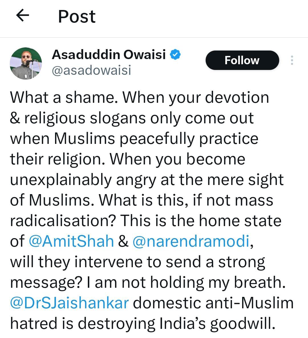 गुजरात यूनिवर्सिटी की घटना पर एआईएमआईएम चीफ असदुद्दीन ओवैसी ने सोशल मीडिया प्लेटफार्म एक्स पर लिखा कितनी शर्म की बात है। जब आपकी भक्ति और धार्मिक नारे तभी सामने आते हैं जब मुसलमान शांतिपूर्वक अपने धर्म का पालन करते हैं। जब आप मुसलमानों को देखकर बेवजह क्रोधित हो जाते हैं। यह सामूहिक कट्टरवाद नहीं तो क्या है? यह अमित शाह और नरेंद्र मोदी का गृह राज्य है, क्या वे कड़ा संदेश देने के लिए हस्तक्षेप करेंगे? मैने अपनी सांस नहीं रोक रखी है।गुजरात यूनिवर्सिटी में दो पक्षों मे मारपीट, अहमदाबाद के पुलिस कमिश्नर ज्ञानेंद्र सिंह मलिक ने बताया पूरा मामला...#गुजरातपुलिस #GujaratUniversity #Ahmedabad #BREAKING_NEWS #Gujarat pic.twitter.com/vByq1yOh0k