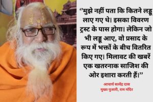 मुख्य पुजारी आचार्य सत्येंद्र दास ने कहा है कि इस साल 22 जनवरी को आयोजित प्राण प्रतिष्ठा (मूर्ति स्थापना) समारोह के दौरान भक्तों को तिरुपति मंदिर के लड्डू प्रसाद के रूप में वितरित किए गए थे। आंध्र प्रदेश के प्रसिद्ध तिरुपति मंदिर के लड्डुओं में जानवरों की चर्बी पाए जाने के विवाद के बीच मुख्य पुजारी की इस टिप्पणी ने इस मामले को और गरमा दिया है।