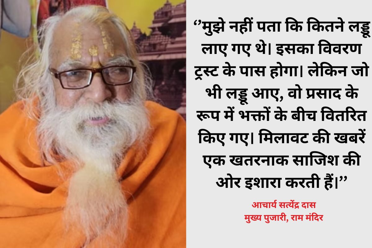 एक मीडिया चैनल से बात करते हुए आचार्य सत्येंद्र दास ने कहा, "मुझे नहीं पता कि कितने लड्डू लाए गए थे। इसका विवरण ट्रस्ट के पास होगा। लेकिन जो भी लड्डू आए, वो प्रसाद के रूप में भक्तों के बीच वितरित किए गए। मिलावट की खबरें एक खतरनाक साजिश की ओर इशारा करती हैं।"