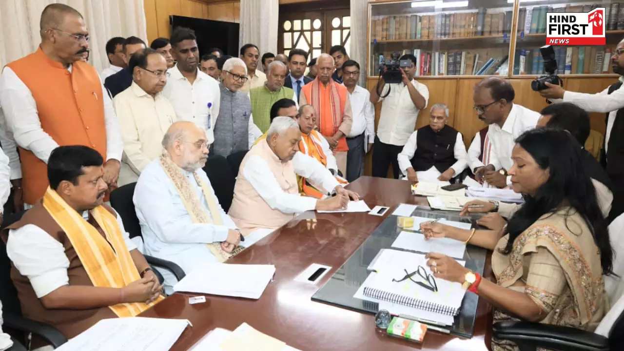 जेडीयू प्रमुख नितीश कुमार और भाजपा अध्यक्ष नबीन ने दिल्ली से आए केंद्रीय गृह मंत्री अमित शाह की उपस्थिति में अपना नामांकन पत्र दाखिल किया।