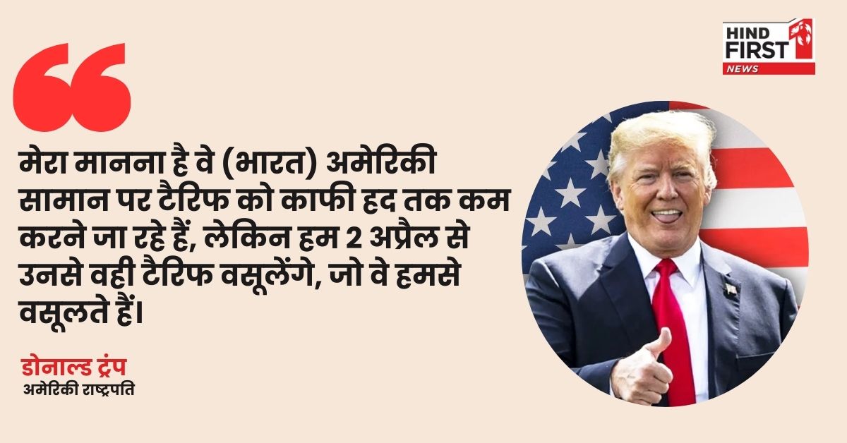 अमेरिकी राष्ट्रपति डोनाल्ड ट्रंप ने कहा कि 2 अप्रैल से अमेरिका भारत पर वही टैरिफ लगाएगा, जो भारत अमेरिकी सामान पर लगाता है।