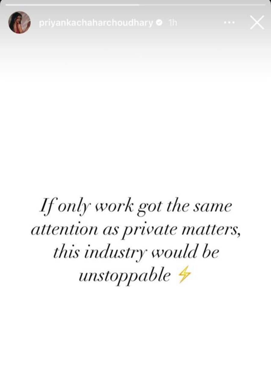 हाल ही में उन्हें एक इवेंट में भी देखा गया, जहां ये एक-दूसरे को नज़रअंदाज़ कर दिया। अब, हम उनके ब्रेकअप के बारे में बहुत सी कहानियाँ और गपशप सुन रहे हैं। प्रियंका (Priyanka Chahar Chaudhary)अपनी निजी ज़िंदगी के बारे में लगातार हो रही चर्चाओं से बहुत परेशान हैं। उन्होंने इन कहानियों की आलोचना करने के लिए इंस्टाग्राम का सहारा लिया।उन्होंने इंस्टाग्राम स्टोरीज़ पर एक नोट शेयर किया। उन्होंने लिखा, "अगर काम को निजी मामलों जितना ही तवज्जो मिले, तो यह इंडस्ट्री अजेय हो जाएगी