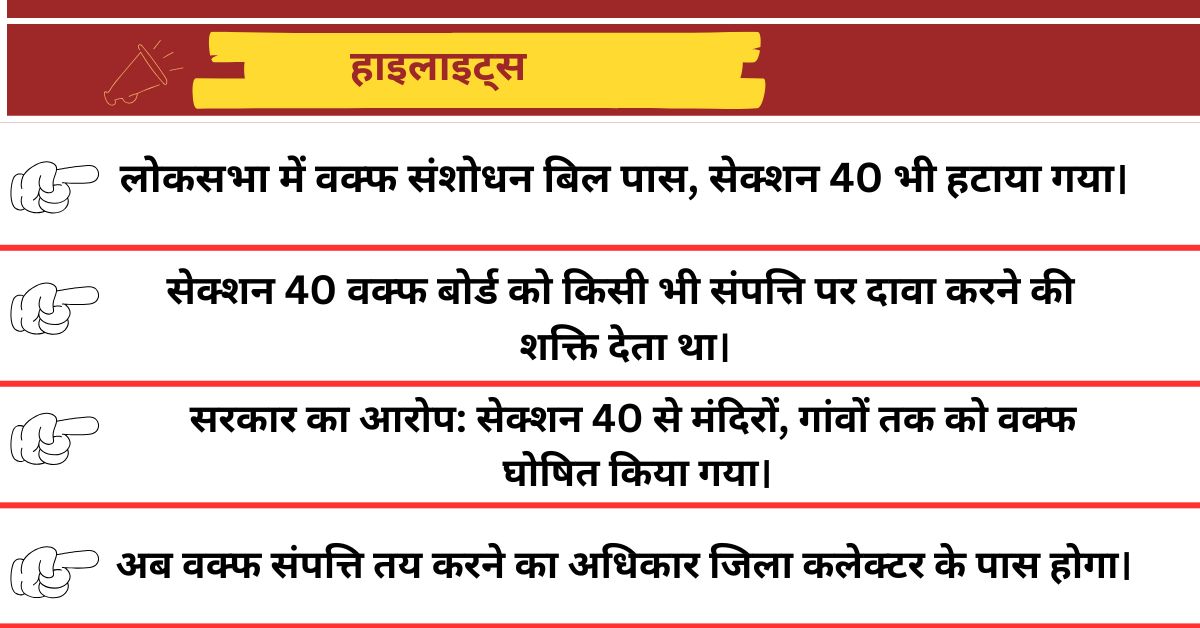 लोकसभा में वक्फ संशोधन विधेयक 2024 पास, सेक्शन 40 खत्म। वक्फ बोर्ड की संपत्ति निर्धारण शक्ति अब जिला कलेक्टर के पास। जानिए इस बदलाव का असर।