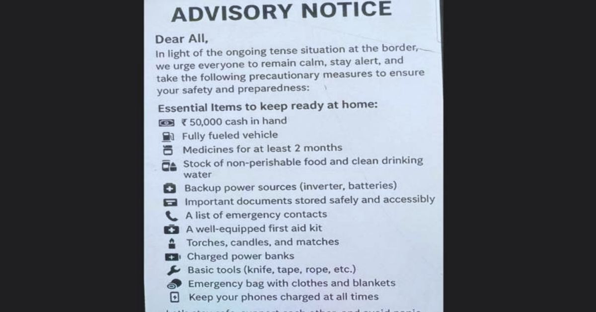 इन दिनों सोशल मीडिया पर एक एडवाइजरी बड़ी तेजी से वायरल हो रही है जिसमें दावा किया गया है कि कुछ दिनों के लिए घर में पर्याप्त भोजन और पानी का भंडारण करके रखें। साथ ही 50 हजार तक कैश भी अपने पास रखें, तो आपको बता दें कि ये फर्जी पोस्ट है और आपको ऐसी पोस्ट से सावधान रहने की सलाह दी जाती है। सबसे पहले तो आप शांत रहें और इन अफवाहों से बचें। नागरिकों को इससे घबराने की जरूरत नहीं है। घबराहट में गलत निर्णय लेने की संभावना बढ़ जाती है। साथ ही रेडियो, टीवी या आधिकारिक ऑनलाइन पोर्टलों के माध्यम से नवीनतम और सत्यापित जानकारी प्राप्त करते रहें।