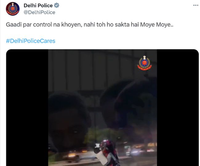 इतना ही नहीं बल्कि दिल्ली पुलिस ने भी इस गाने का इस्तेमाल कर तेज गाड़ी चलाने के लिए वॉर्निंग जारी की है। इस विडियो में पुलिस ने एक आदमी की बाइक पर स्टंट मारते हुए विडियो शेयर किया, जिसका कैप्शन बेहद मजेदार था। X पर यह विडियो शेयर कर दिल्ली पुलिस ने लिखा- गाड़ी पर कंट्रोल न खोएं, नहीं तो हो जाएगा मोए मोए।