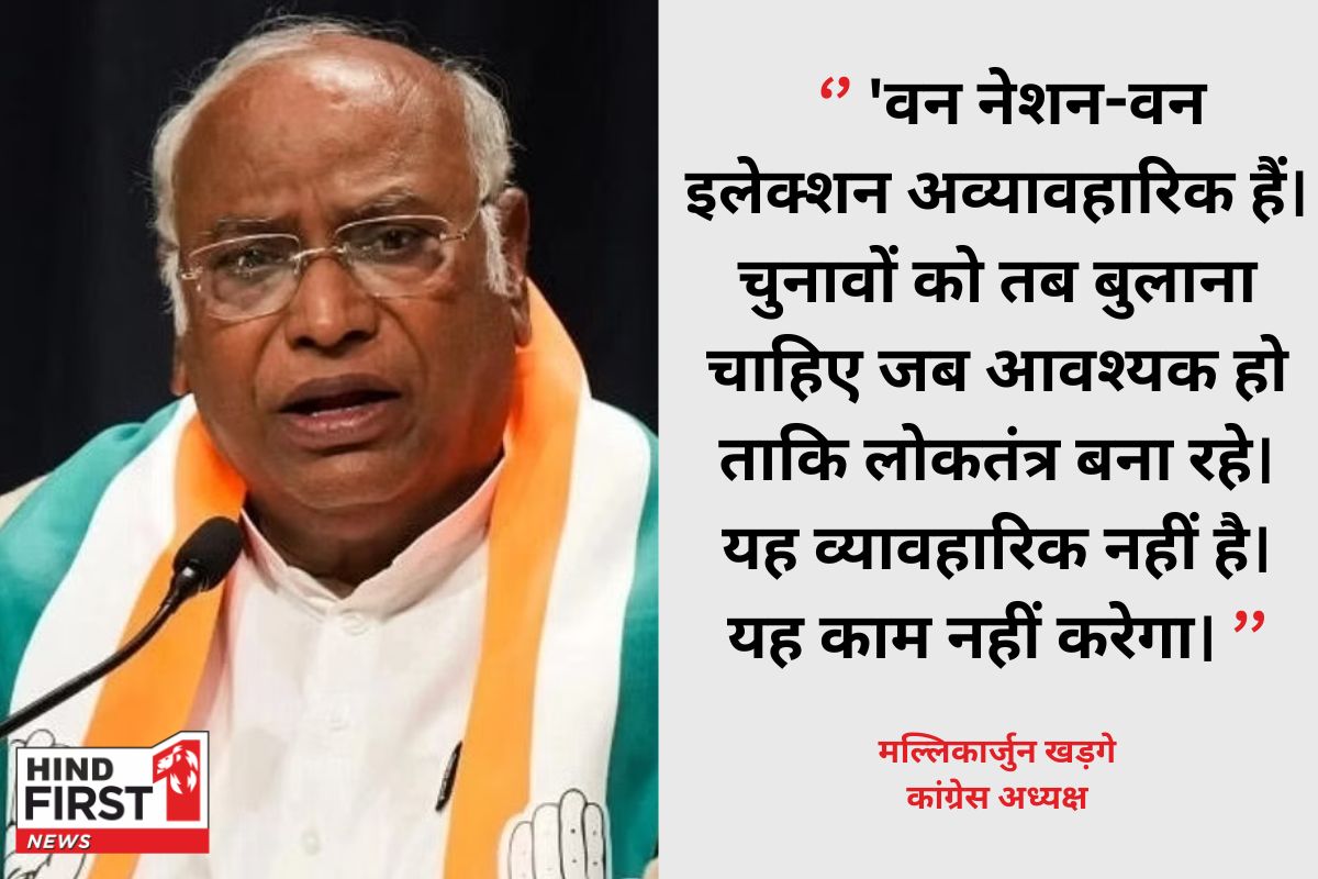हालांकि, विपक्ष ने मोदी सरकार के 'वन नेशन-वन इलेक्शन' प्रस्ताव पर हमला किया है। विपक्ष ने इसे सस्ती राजनीति करार दिया। कांग्रेस ने इसे अव्यावहारिक बताते हुए कहा कि इसे भारत जैसे देश में लागू करना असंभव होगा। मल्लिकार्जुन खड़गे कांग्रेस अध्यक्ष मल्लिकार्जुन खड़गे ने फिर से अपने रुख को स्पष्ट करते हुए कहा कि समकालिक चुनाव अव्यावहारिक हैं। उन्होंने कहा कि चुनावों को तब बुलाना चाहिए जब आवश्यक हो ताकि लोकतंत्र बना रहे।