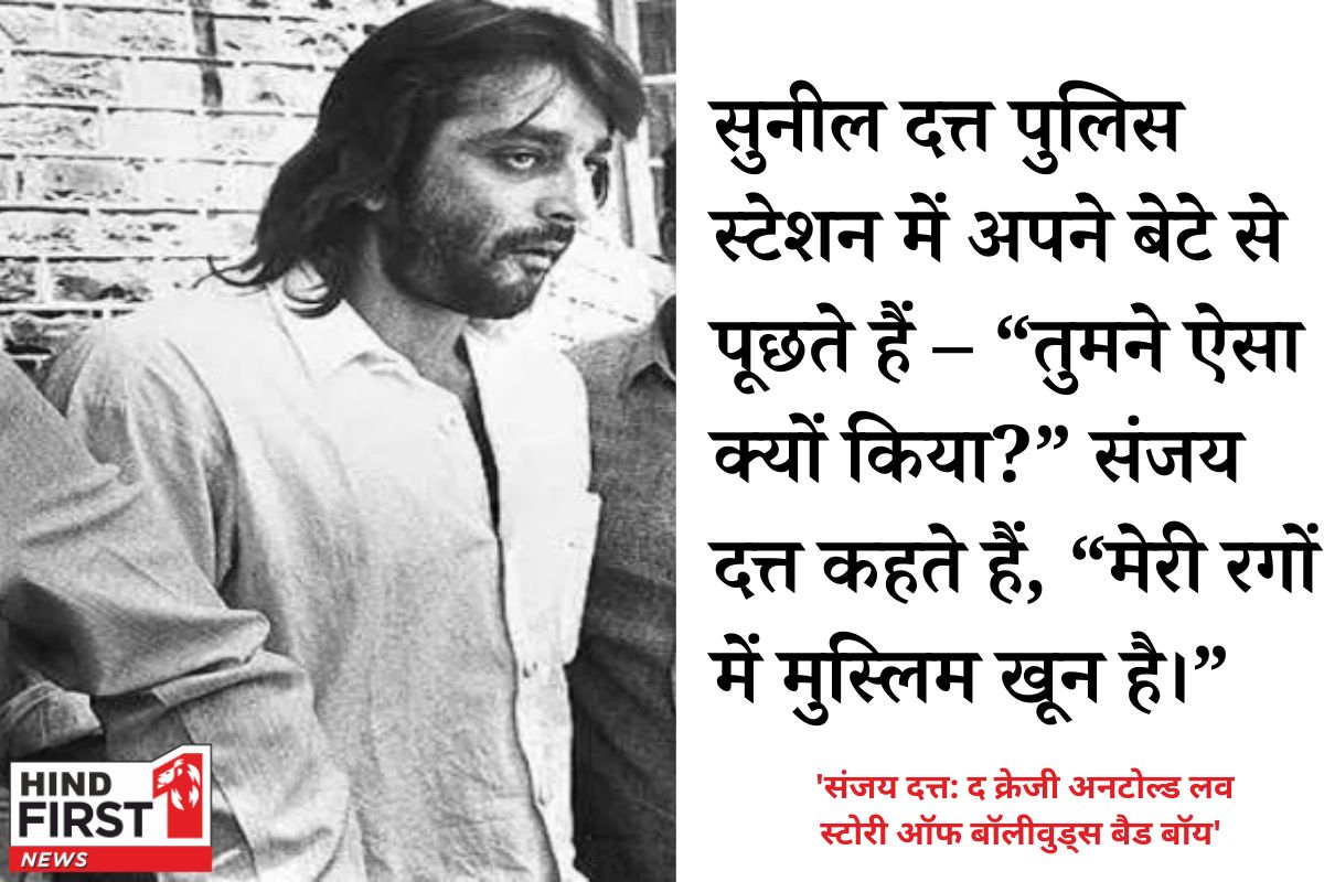 यह घटना किताब 'संजय दत्त: द क्रेजी अनटोल्ड लव स्टोरी ऑफ बॉलीवुड्स बैड बॉय' (The Crazy Untold Story of Bollywood's Bad Boy Sanjay Dutt' ) में भी दर्ज है, जिसे लेखक यासिर उस्मान ने लिखा है। इस किताब में संजय दत्त की जेल की यात्रा और उनके विवादित जीवन की कहानियां शामिल हैं। साल 1993 में मुंबई बम ब्लास्ट के मामले में संजय दत्त का नाम आने के बाद, उन्हें गिरफ्तार किया गया और जेल भेजा गया था। किताब के मुताबिक, 90 के दशक में मुंबई बम धमाकों के बाद शहर में गम का माहौल था। संजय दत्त, जिनका नाम इस घटना में शामिल होने के चलते चर्चाओं में था, पुलिस की पूछताछ के दौरान जेल की सलाखों के पीछे थे। संजय दत्त ने इस मामले में सरेंडर किया था, लेकिन उनके पिता सुनील दत्त इस बात को स्वीकार करने में कठिनाई महसूस कर रहे थे कि उनका बेटा इस बम ब्लास्ट में शामिल हो सकता है। इस मामले की जांच कर रहे डिप्टी पुलिस कमिशनर राकेश मारिया ने संजय दत्त से साफ तौर पर पूछा कि सच क्या है। इस पर संजय ने स्वीकार किया कि उन्होंने दाऊद इब्राहिम के भाई अनीस इब्राहिम से मिली एक राइफल और कुछ गोला-बारूद को अपने पास छिपाया था। संजय दत्त ने बताया कि उन्होंने यह सामग्री बम धमाकों में इस्तेमाल के लिए नहीं, बल्कि अपनी सुरक्षा के लिए रखी थी। संजय दत्त की इस बात को सुनकर सुनील दत्त को गहरा सदमा पहुंचा। उन्होंने केवल एक ही सवाल पूछा, "क्यों?" संजय का जवाब था, "क्योंकि मेरी रगों में मुसलमान का खून है। मैं शहर में हुए घटनाओं को बर्दाश्त नहीं कर सकता।" संजय दत्त का यह बयान बाबरी मस्जिद विवाद के संदर्भ में था, जो 1992 में हुआ था और जिसके बाद मुंबई में बम धमाके हुए थे। सुनील दत्त यह सुनकर बिना कुछ कहे पुलिस हेडक्वार्टर से बाहर चले गए।