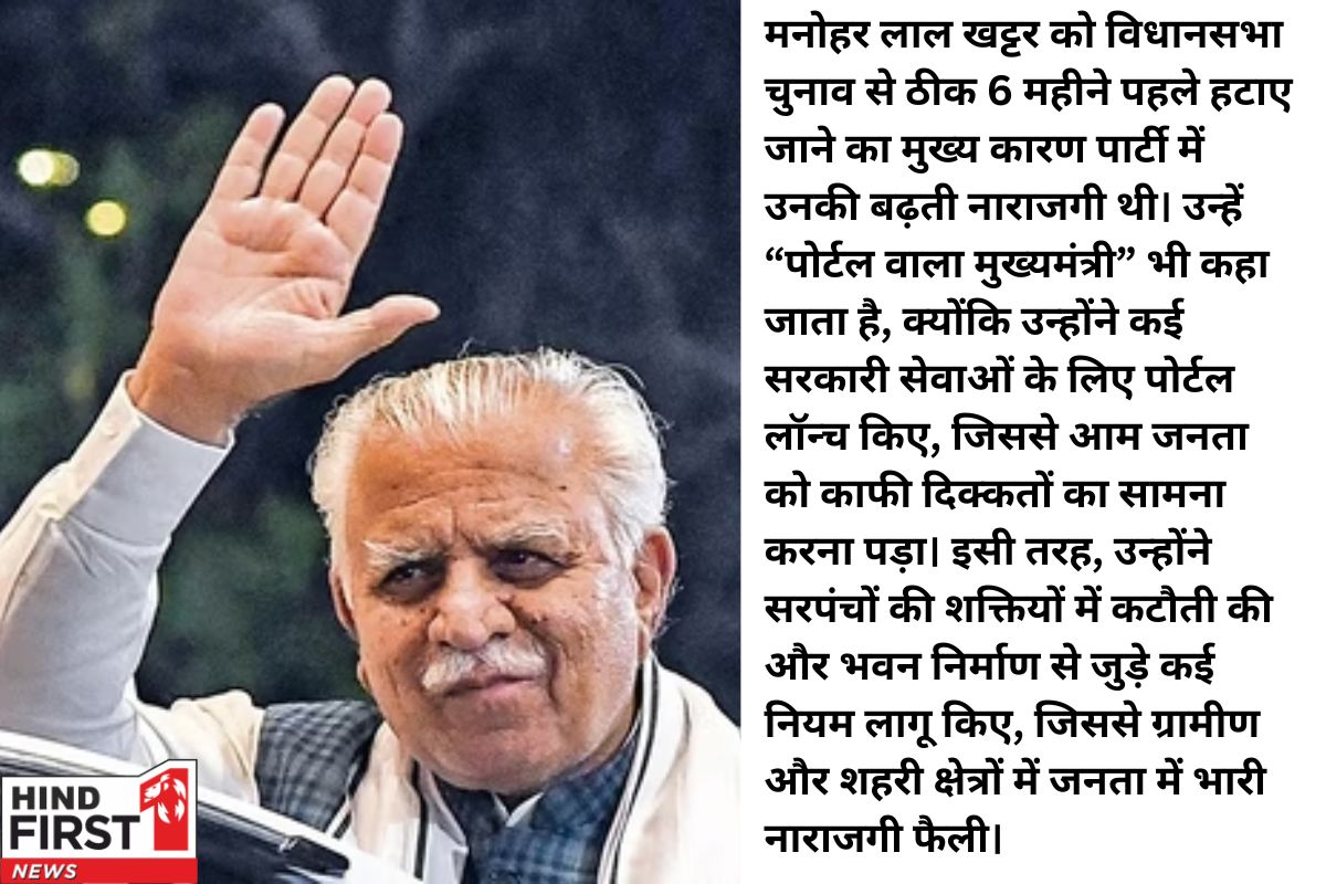 मनोहर लाल खट्टर को विधानसभा चुनाव से ठीक 6 महीने पहले हटाए जाने का मुख्य कारण पार्टी में उनकी बढ़ती नाराजगी थी। उन्हें “पोर्टल वाला मुख्यमंत्री” भी कहा जाता है, क्योंकि उन्होंने कई सरकारी सेवाओं के लिए पोर्टल लॉन्च किए, जिससे आम जनता को काफी दिक्कतों का सामना करना पड़ा। इसी तरह, उन्होंने सरपंचों की शक्तियों में कटौती की और भवन निर्माण से जुड़े कई नियम लागू किए, जिससे ग्रामीण और शहरी क्षेत्रों में जनता में भारी नाराजगी फैली।खट्टर के फैसलों से हुई बीजेपी की मुश्किलें