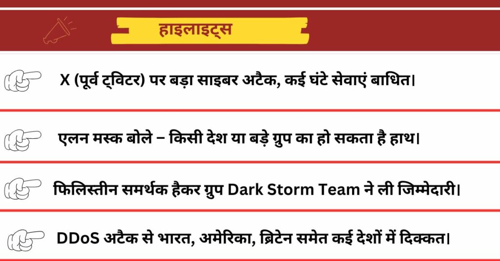 एलन मस्क के X पर बड़े साइबर अटैक से घंटों सेवाएं बाधित रहीं। फिलिस्तीन समर्थक हैकर ग्रुप Dark Storm Team ने जिम्मेदारी ली।