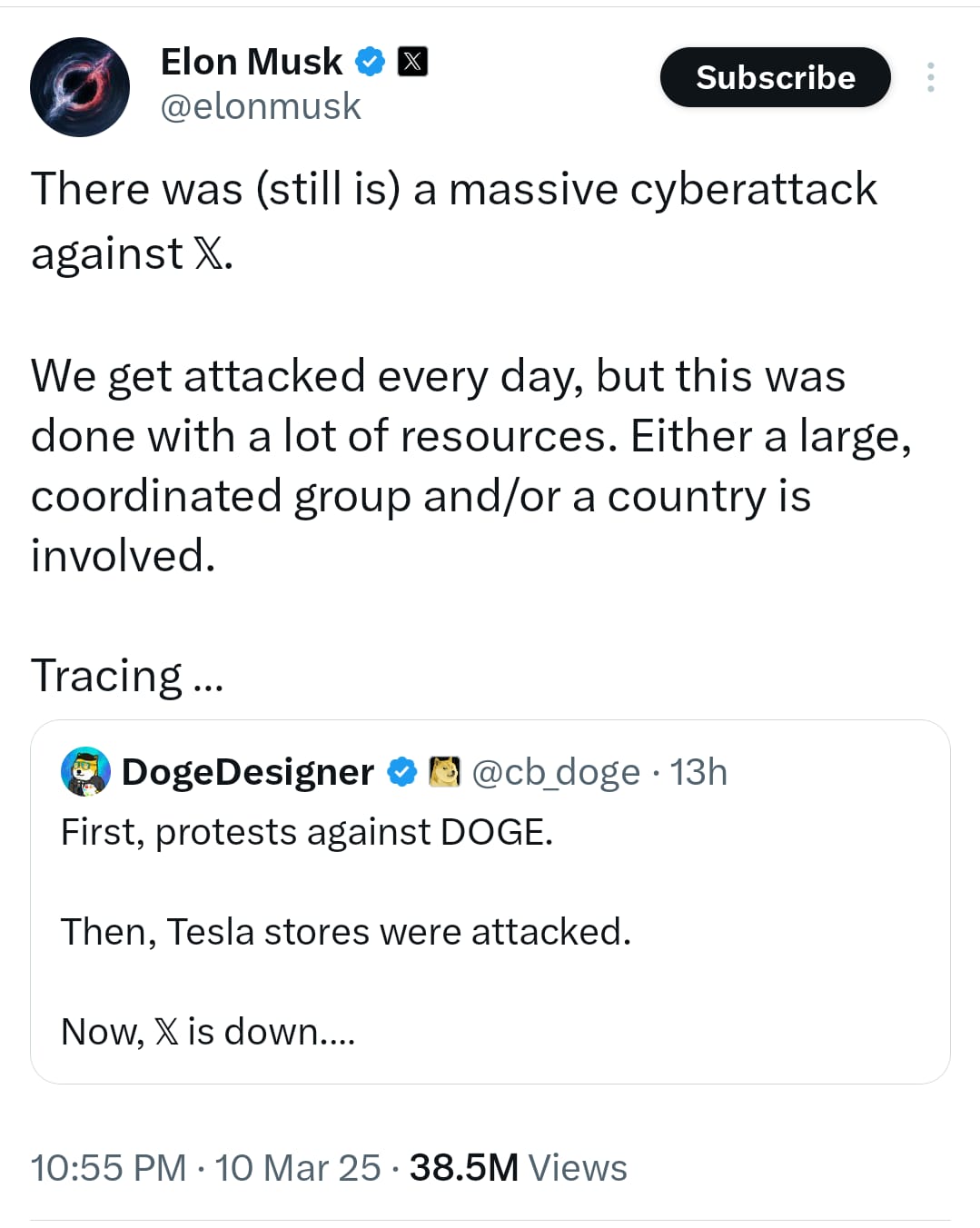 एलन मस्क ने इस घटना को "बड़ा साइबर अटैक" बताया। उन्होंने कहा, "यह एक बड़ा साइबर अटैक है। हो सकता है कि इसमें किसी बड़े ग्रुप या किसी देश का हाथ हो। हालांकि, इस अटैक के पीछे का मकसद अभी साफ नहीं है।" मस्क ने यह भी कहा कि X पर रोज साइबर अटैक होते हैं, लेकिन यह हमला बहुत तैयारी के साथ किया गया था।